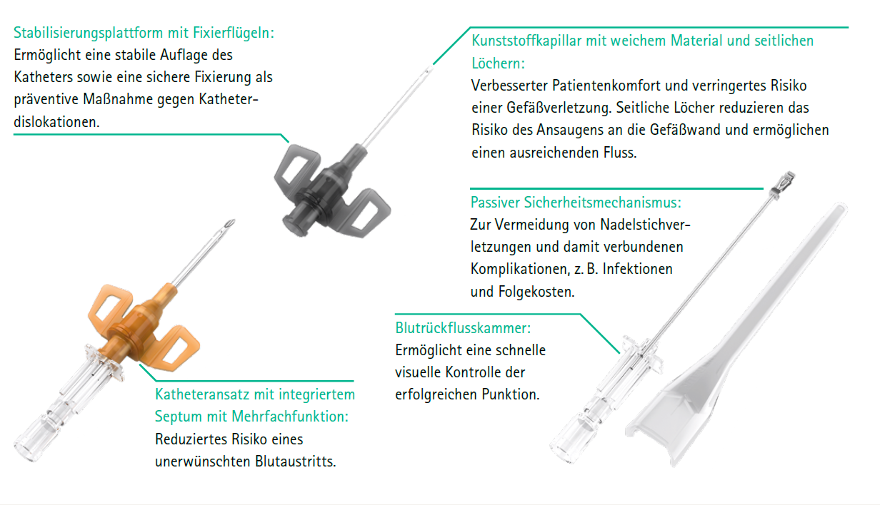 Damit werden Gefäßverletzungen bei Patienten vermieden, bei denen das Bewegungsrisiko während der Behandlung erhöht ist. Auch die Sicherheit des Pflegepersonals, wird erhöht.