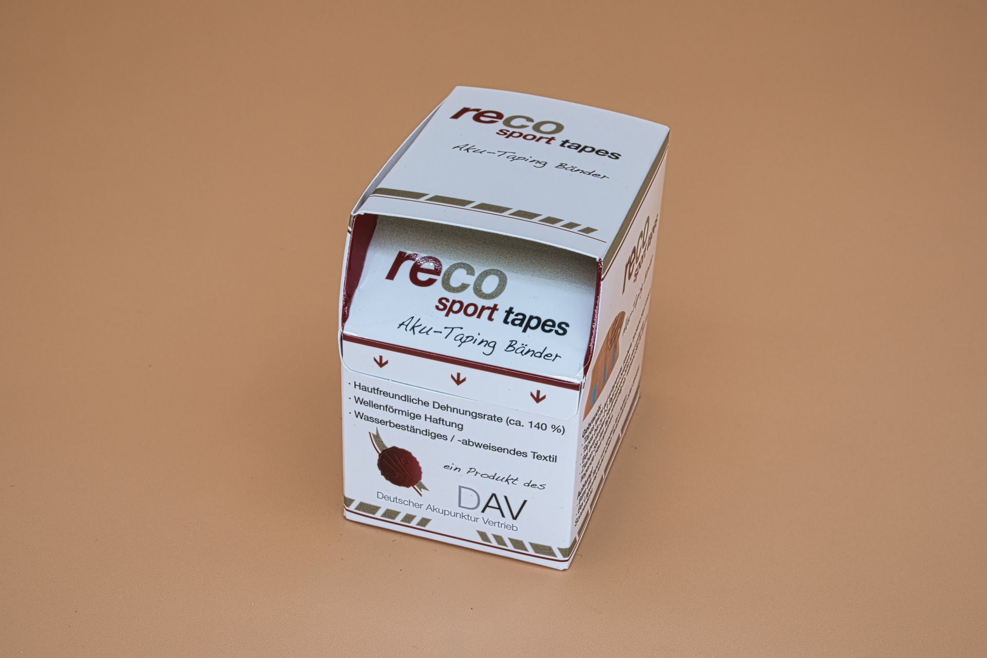 Besonders hochwertige Aku-Tapes der Marke reco® für Kinesiologie-Behandlungen im praktischen Spender